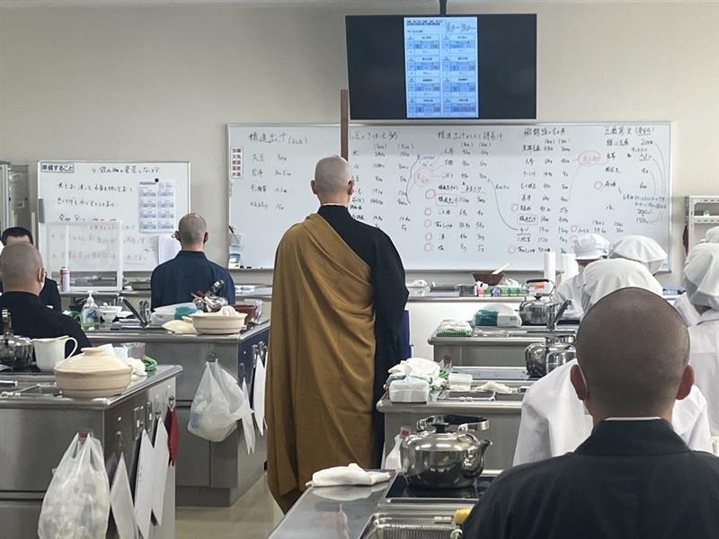12月12日金曜日、健康栄養学科1年生が応用調理学実習で精進料理を学びました。今年の献立は、小豆とさつまいも粥、精進出汁ガラ入りけんちん汁、飛龍頭の含め煮、豆腐寒天の4品です。この企画は全国曹洞宗青年会の若き僧侶の方々のご協力で毎年成道会(12月8日)に近い日程で行われております。「精進料理」は動物性の食品を全く使わないだけでなく、食品全てを使い切り野菜クズを出さない工夫がなされています。自分の食べるものの命の尊さ、食品を作ってくださった方々への感謝について僧侶の方々から心に沁みるお話をいただきました。また、木村学長先生からは建学の精神である「行学一体」と精進料理についてお言葉がありました。各グループに1人ずつ僧侶の方が配属され、大変丁寧にお料理の手ほどきをいただきました。僧侶の方の中には愛知学院大学の卒業生の方もおられ、懐かしい学生時代のお話を聞いくことができました。食事の後には座禅です。驚策(きょうさく)を持った僧侶の方が見回る中、精神を集中して椅子で姿勢を正します。精進料理作りを通して、多くの学びがある一日でした。ご協力いただいた皆様に感謝いたします。